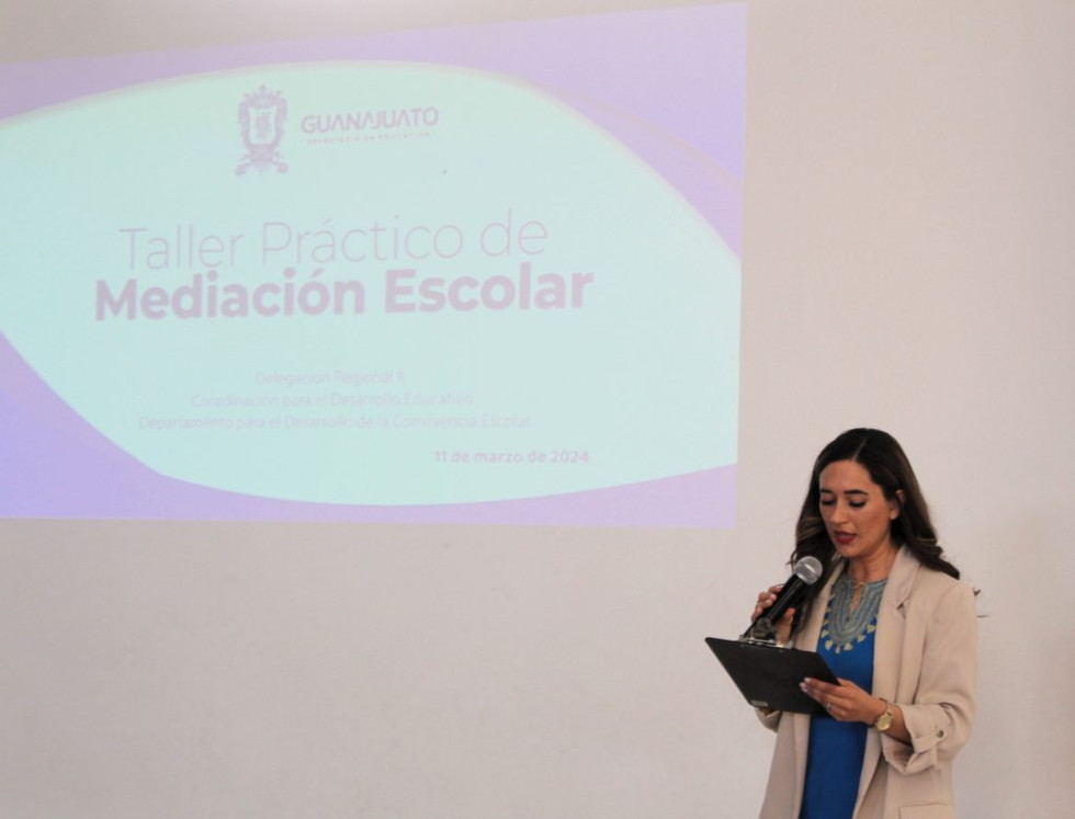 San José Iturbide, Gto. 13 de marzo de 2024.- Autoridades educativas, directivos y docentes de educación básica, adscritos a la Delegación II, fortalecen su formación al capacitarse en materia de mediación escolar, con el fin de consolidar sus conocimientos previos y adquirir herramientas para construir la paz duradera en los centros escolares.